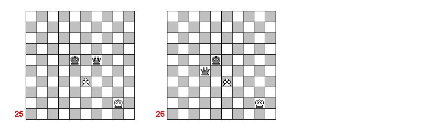 Теперь диаграмма 24. Черная пешка ладейная. Белый король на расстоянии четырех ходов от горизонтали превращения черной пешки. Начнем: 1. Фe2+ Крb1 2. Фd1+ Крb2 3. Фd2+ Крb1. В 64 клеточных шахматах далее события развивались бы по следующему сценарию: 4. Крb4 a1Ф 5. Крb3! И либо мат следующим ходом, либо черные теряют ферзя. Или по такому сценарию: 4. Крa4 a1Ф+ 5. Крb3! Исход опять тот же.