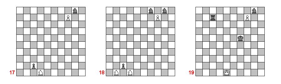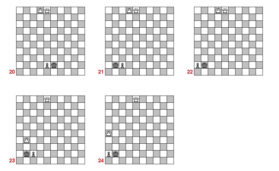А в стоклеточных шахматах выигрыш со слоновыми и ладейными пешками выигрыш невозможен независимо от близости вражеского короля. Ведь если пешка станет принцем, то при близости вражеского короля последний сам окажется в смертельной опасности. Проиллюстрируем это на диаграммах 20, 21 и 22, заодно и напомним, как это делается в 64 клеточных шахматах. Белые пешки ход назад стали ферзями, а черные подошли к порогу превращения (не успели пройти). Ход белых. Начнем с диаграммы 20.
