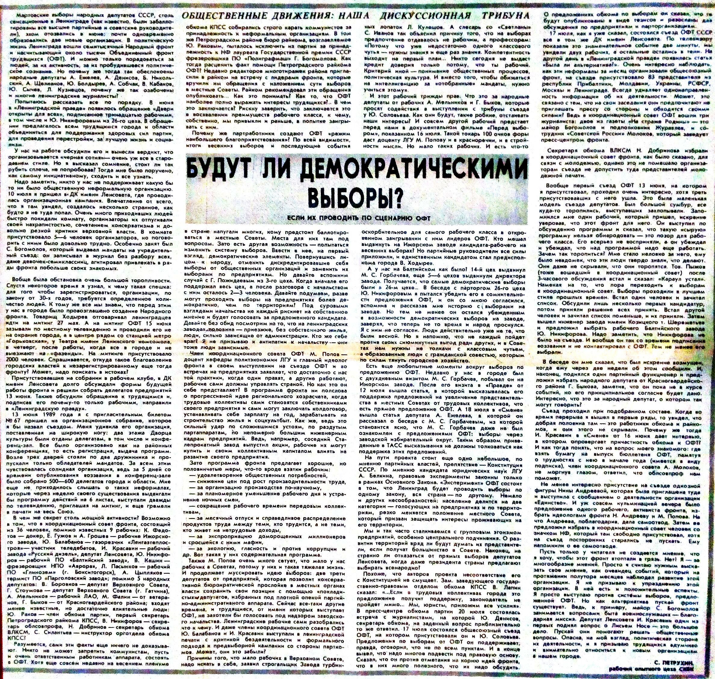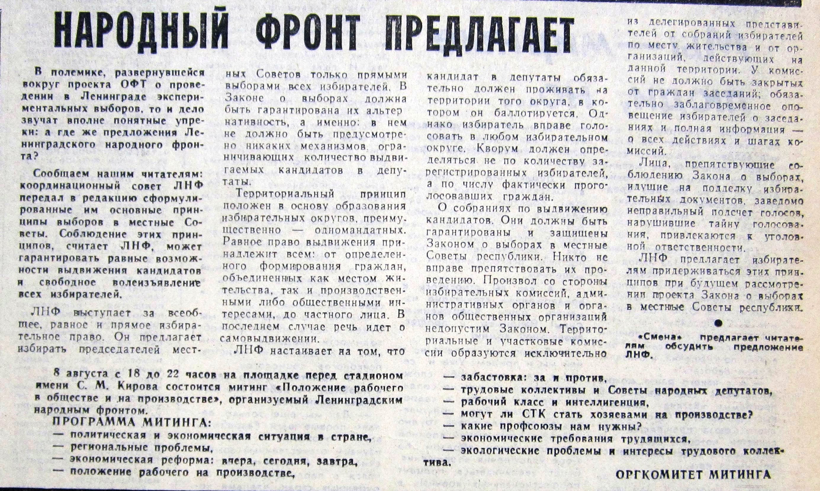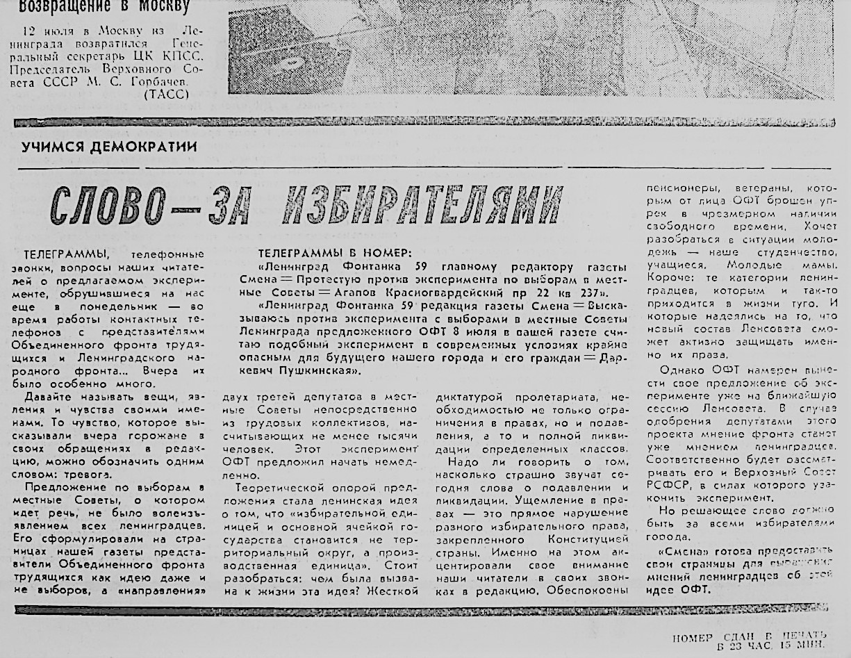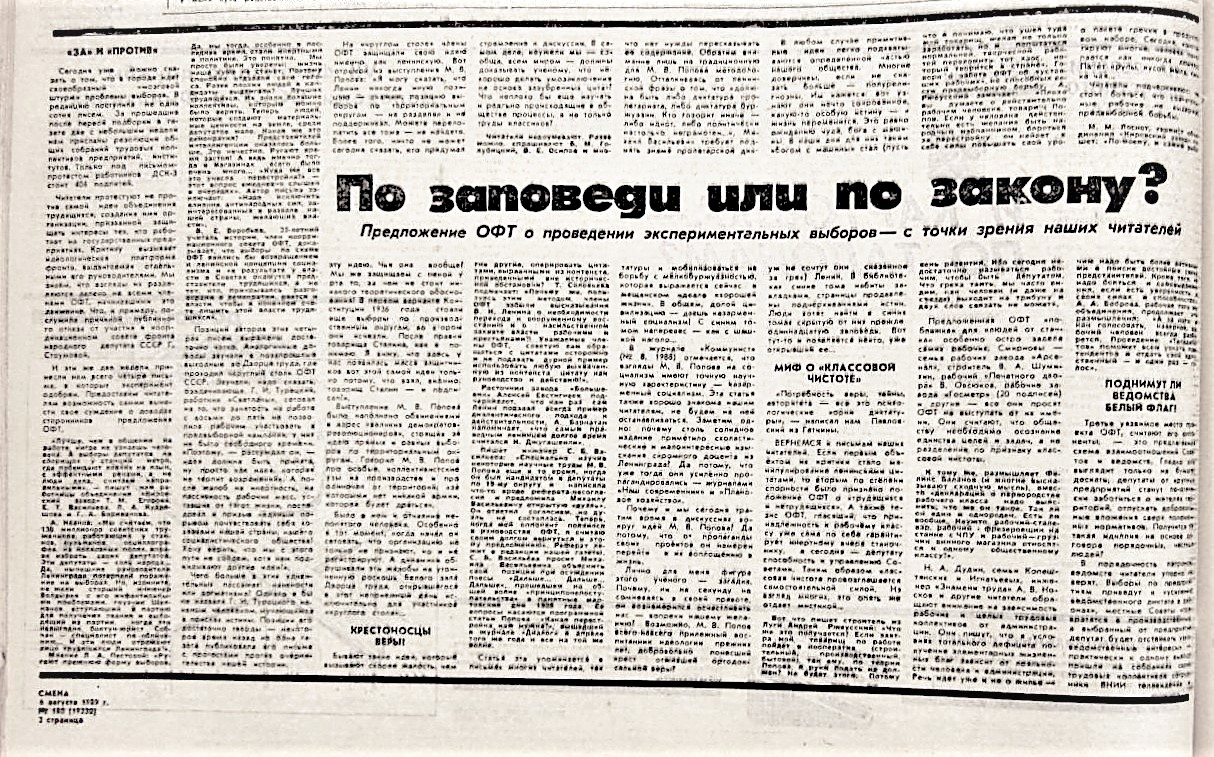 Пошел шум в газетах - за и против. 19 июля 1989 газета «Смена» публикует на целую полосу ответы активистов ОФТ и ЛНФ на вопросы читателей газеты. При этом активистам ОФТ досталось две трети площади, и они подробно освещают идею выборов по производственным округам. В этой дискуссии ЛНФ, на мой взгляд, выглядел так себе, поскольку наши не получили интересных вопросов, чтобы развернуться. Мы тогда были слабы в технике пиара. Не умели, а, скорее, и не хотели «организовать» звонки нашим участникам с интересными вопросами. Наверно, считали это нечестным, хотелось натурально. Натуральность часто получается неуправляемая. И мы видим, что нашим пришлось отвечать случайным людям (а, может, и не очень случайным), зачем вы установили членские взносы, почему бы вам не объединиться с ОФТ, зачем вы выступали против Н.В. Иванова. Это, конечно, крало время, программные взгляды высказать удалось разве что телеграфным стилем. Скан этой газеты - на выставке.