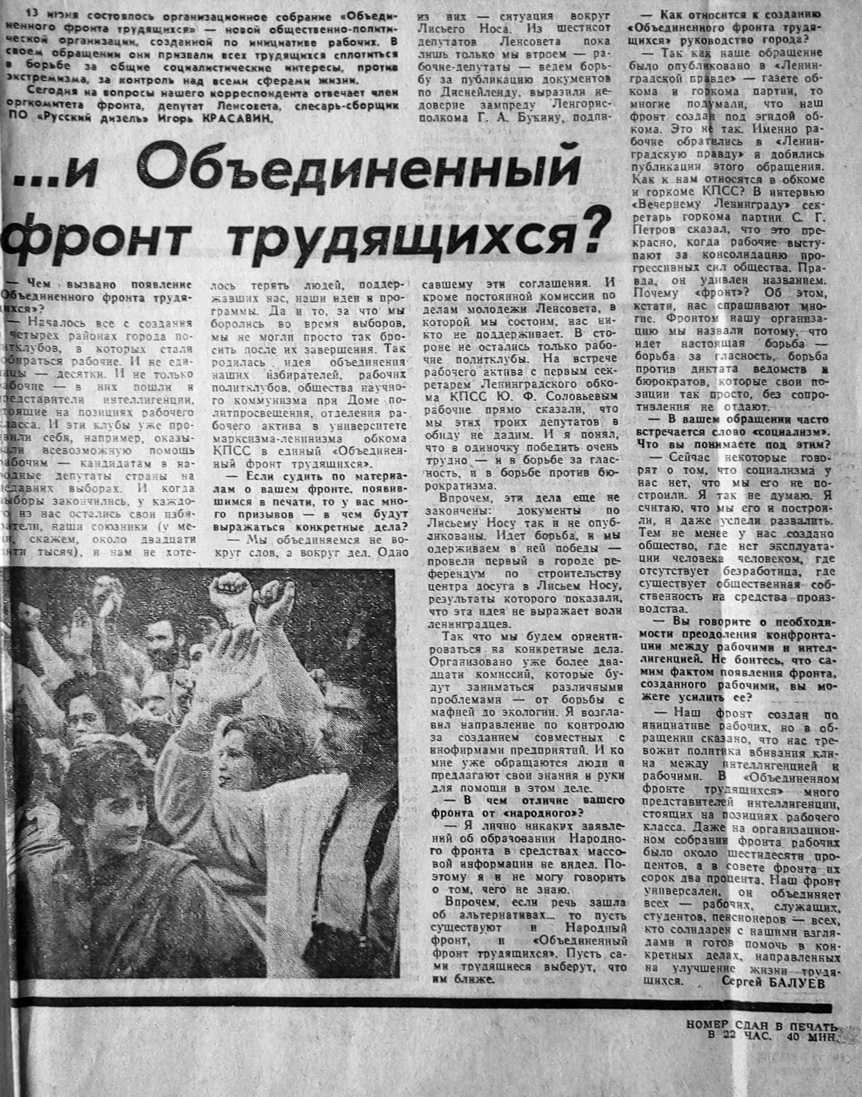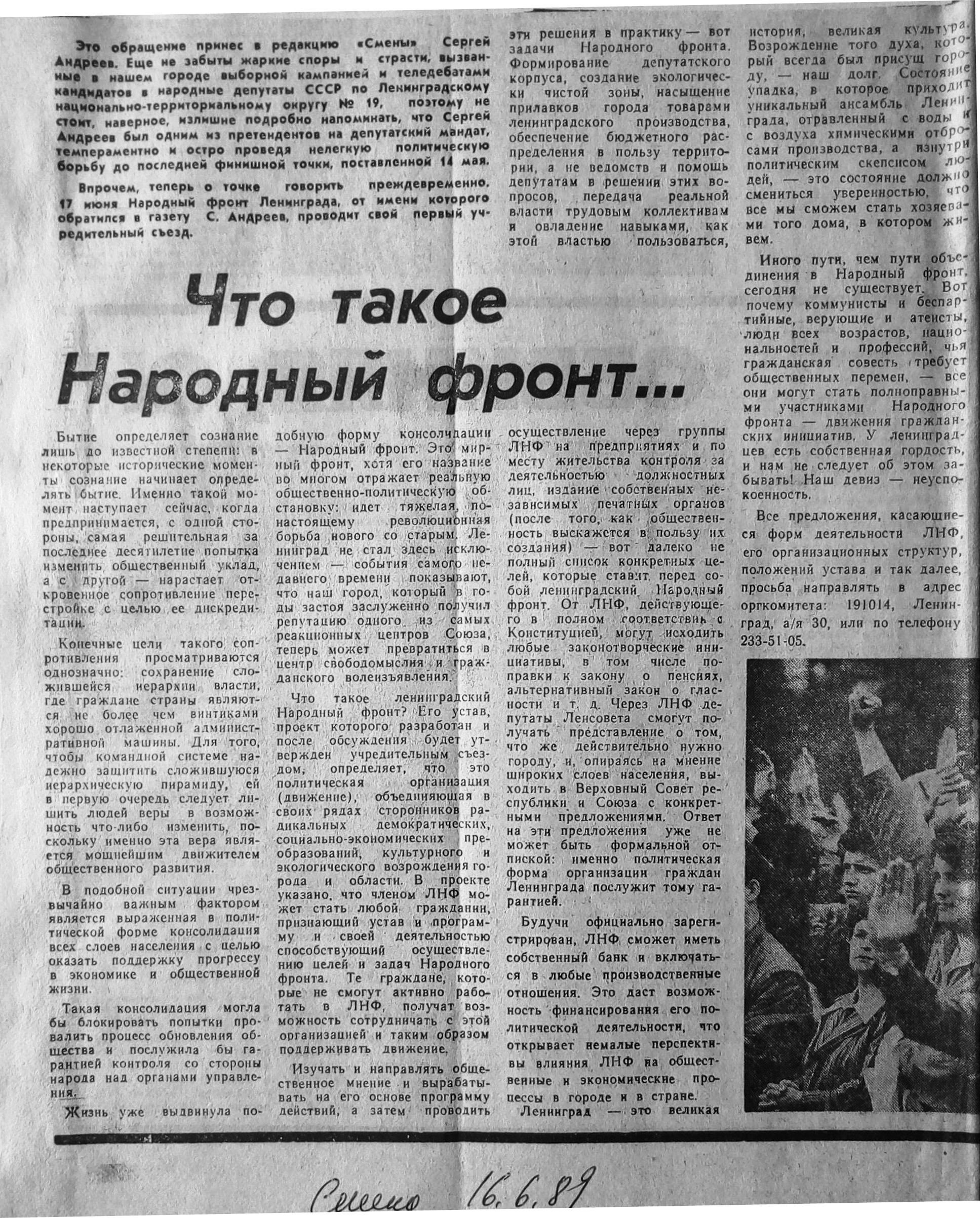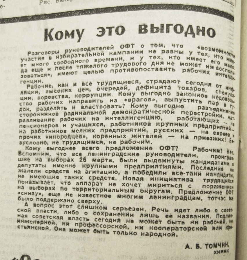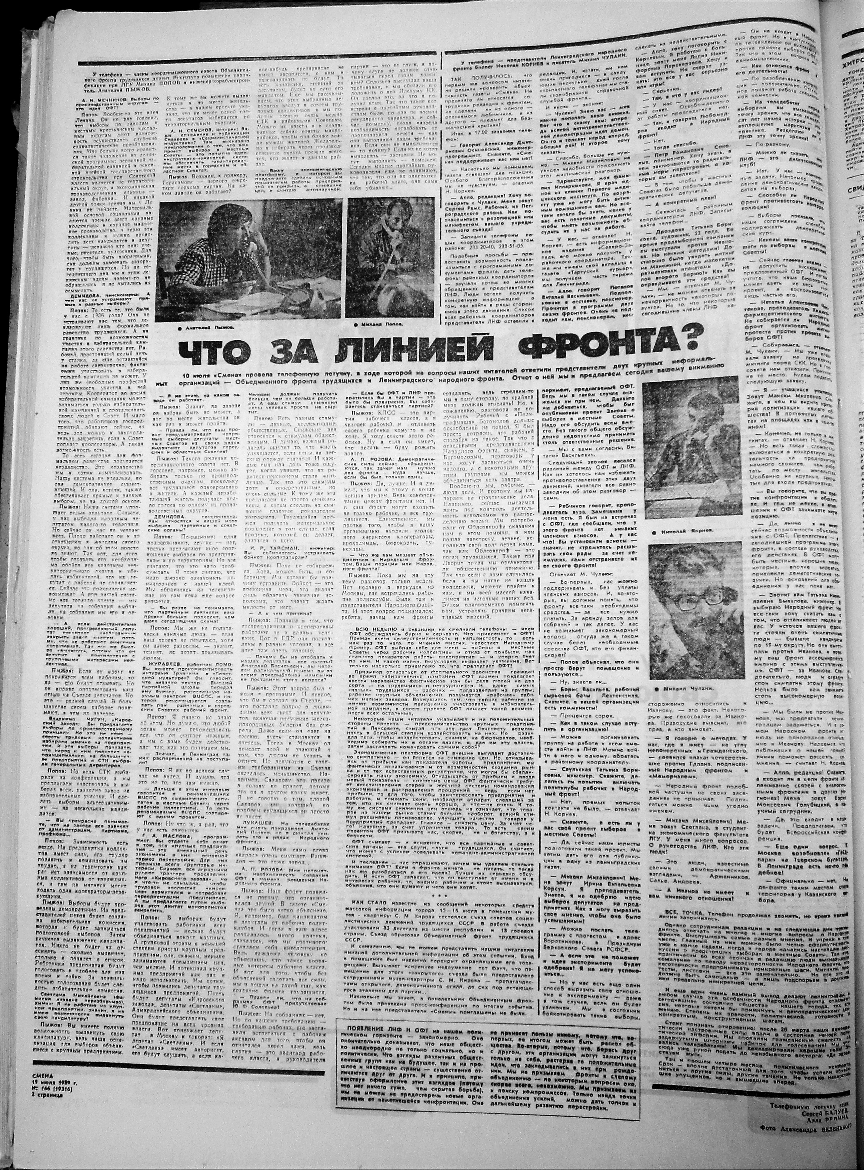 Пошел шум в газетах - за и против. 19 июля 1989 газета «Смена» публикует на целую полосу ответы активистов ОФТ и ЛНФ на вопросы читателей газеты. При этом активистам ОФТ досталось две трети площади, и они подробно освещают идею выборов по производственным округам. В этой дискуссии ЛНФ, на мой взгляд, выглядел так себе, поскольку наши не получили интересных вопросов, чтобы развернуться. Мы тогда были слабы в технике пиара. Не умели, а, скорее, и не хотели «организовать» звонки нашим участникам с интересными вопросами. Наверно, считали это нечестным, хотелось натурально. Натуральность часто получается неуправляемая. И мы видим, что нашим пришлось отвечать случайным людям (а, может, и не очень случайным), зачем вы установили членские взносы, почему бы вам не объединиться с ОФТ, зачем вы выступали против Н.В. Иванова. Это, конечно, крало время, программные взгляды высказать удалось разве что телеграфным стилем. Скан этой газеты - на выставке.