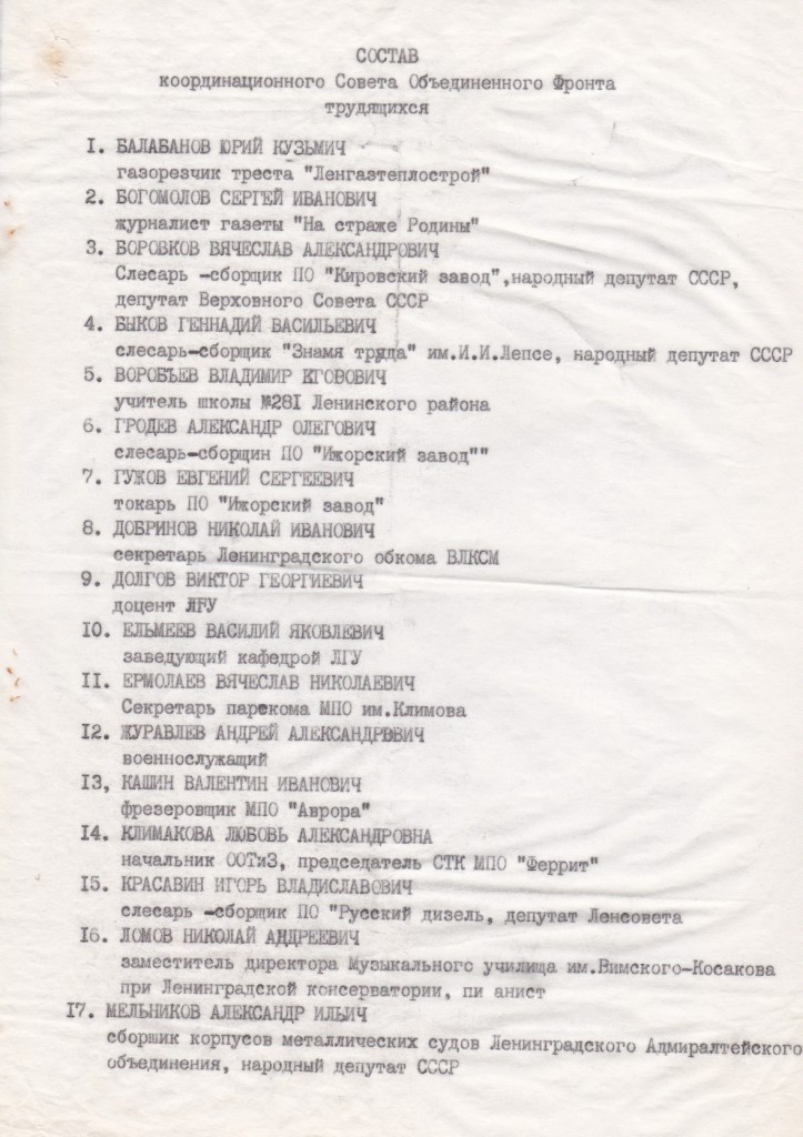 Они защищали даже не коммунистическую идею, ибо сами не знали, как она должна выглядеть. Они защищали свое место в той системе власти, которая многим другим надоела, и ничего не хотели здесь уступить. Кроме КГБ, участие в организации симулякров принимали члены местного аппарата КПСС и зависимое от него руководство предприятий. Но фасад - выборный орган - состоял из рабочих и тех, кого сегодня собирательно называют бюджетниками. Список координационного совета ленинградского ОФТ примерно такого социального состава представлен на этой выставке.