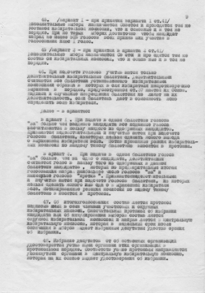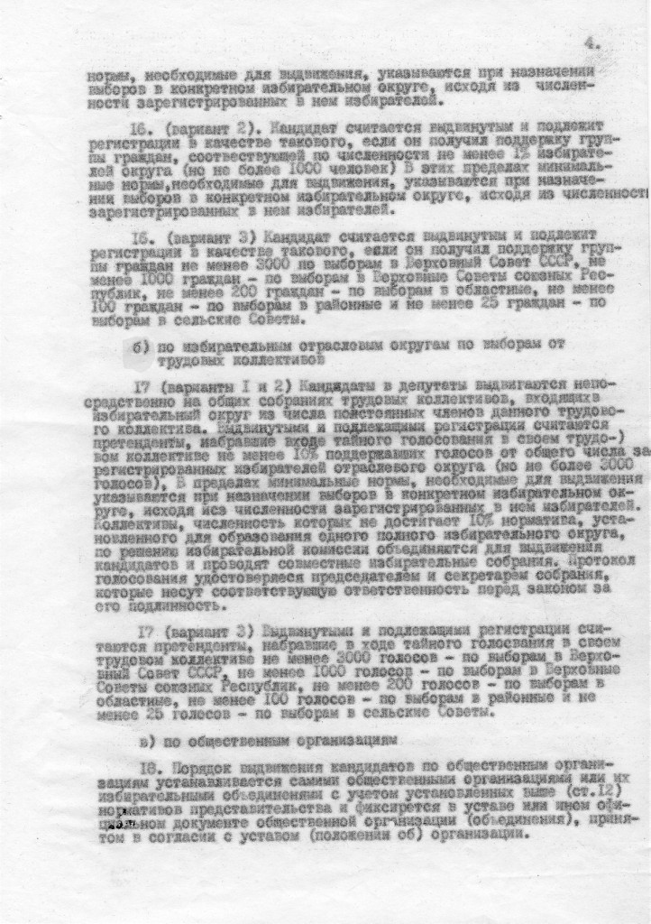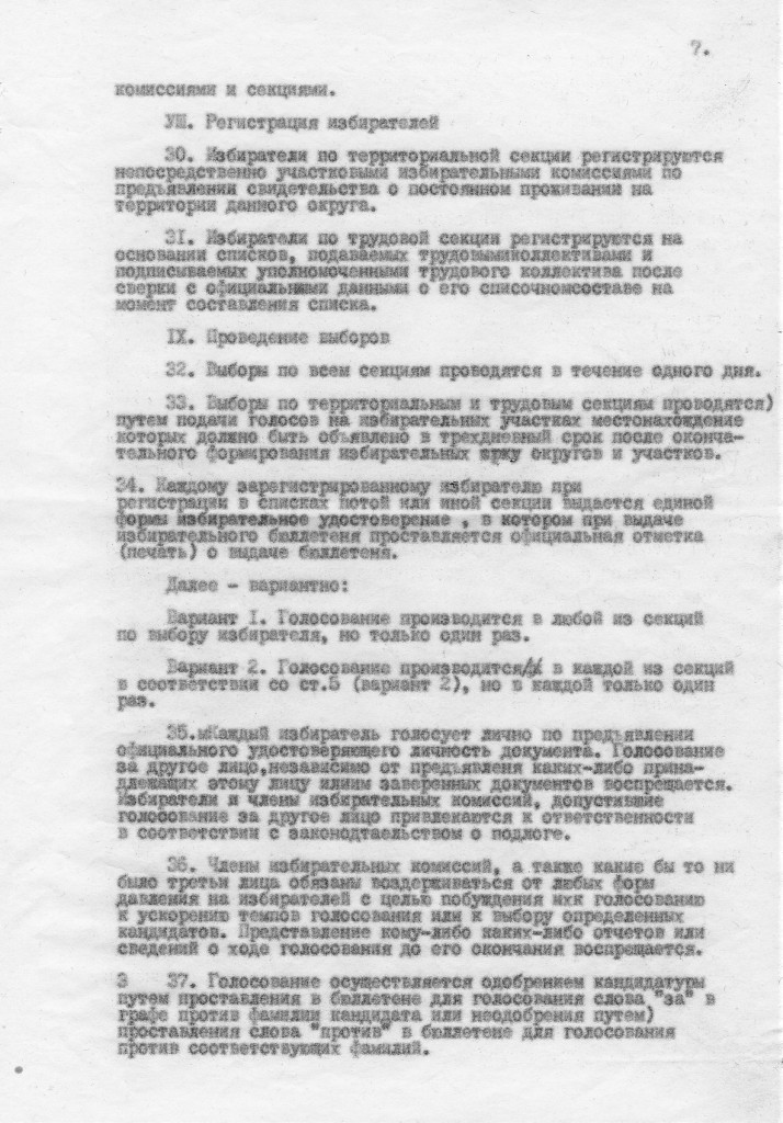 Вариант 2. Каждый избиратель имеет два голоса, подаваемых в каждой из двух общих секций (4а- территориальная и 4б- отраслевая ) на основе единого избирательного удостоверения, на котором при подаче голоса делается отметка об осуществлении права на голосование и третий голос по секции 4в - от общественных организаций по принадлежности к общественной организации или по своему выбору, о чем также делается отметка в избирательном удостоверении. Избиратели, не являющиеся членами трудовых коллективов, голосуют в коллективах по определению низовой избирательной комиссии.