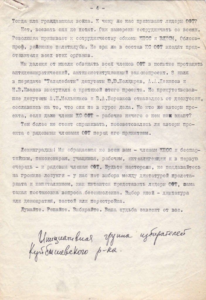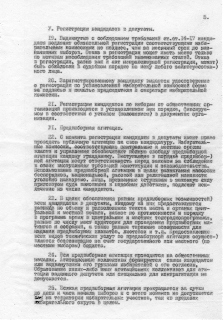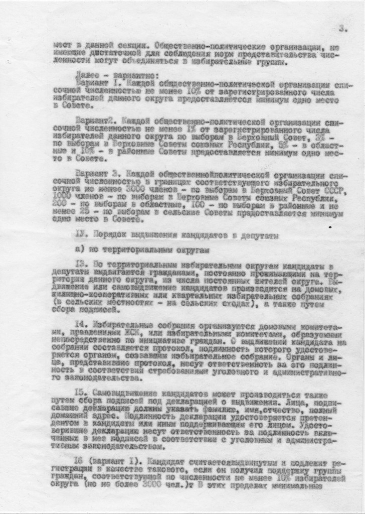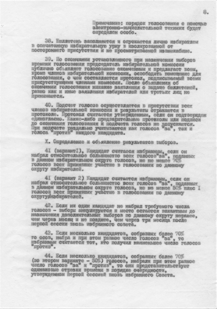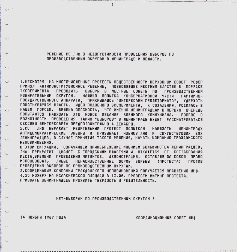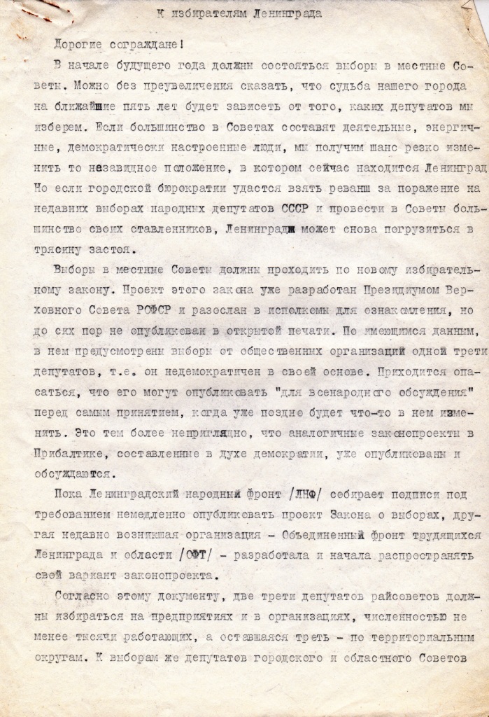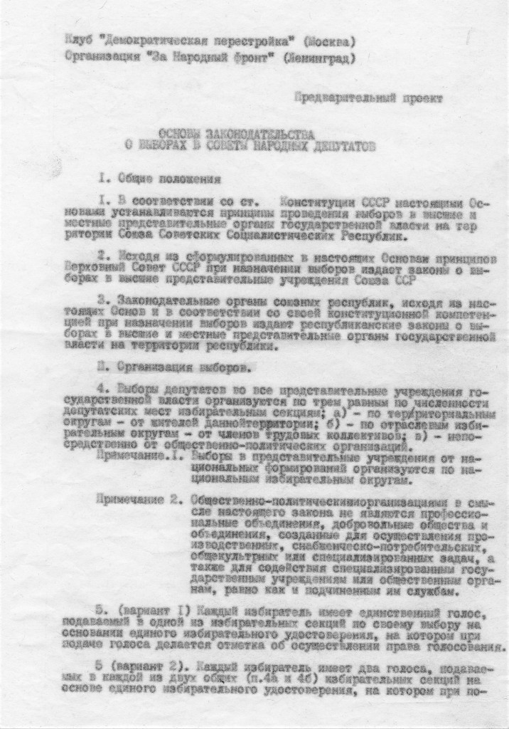 Надо сказать, она выкатилась не в первый раз. В моем хранилище бумаг нашелся проект , который мне достался, видимо, при обсуждении на каком-то собрании предшественника ЛНФ – организации «За Народный фронт» в подвальчике «Клуба-81» на ул. Петра Лаврова (тогда еще), дом 5. Документ назван «Основы законодательства о выборах в советы народных депутатов», в шапке указано, что это предварительный проект и что представляют его клуб «Демократическая перестройка», (Москва) и организация «За Народный фронт» (Ленинград). То есть, авторы надеялись получить одобрение проекта у этих организаций и с этим к ним приходили сами или кого-то прислали. Я не помню, кто принес нам этот проект, но помню, что в организации ЗаНф он был раскритикован.