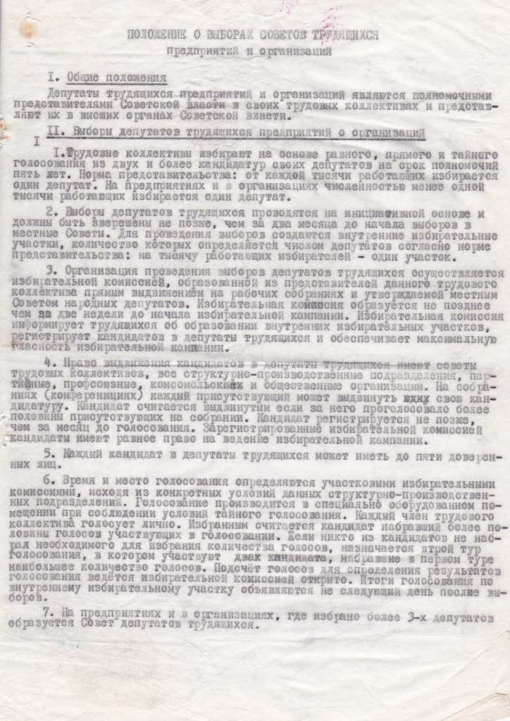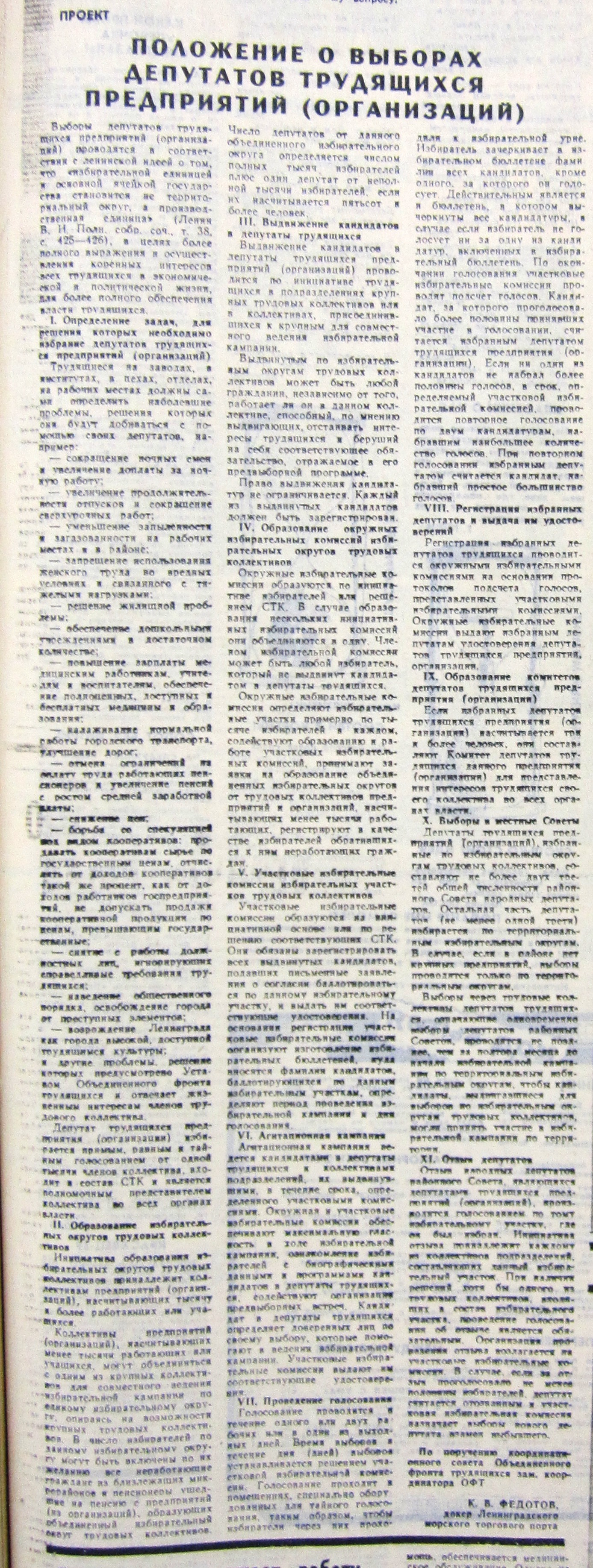 12 августа 1989 г. газета «Смена» публикует идею, наконец, уложенную в форму какого-то документа - проект ОФТ Положение о выборах депутатов трудящихся предприятий (организаций».