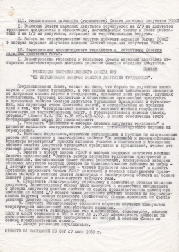 Летом и осенью 1989 г. развивался пиар идеи, формальный и неформальный. В июне в Координационный совет ЛНФ добрые люди принесли машинописные копии Положения о выборах советов трудящихся, якобы принятого КС ОФТ.