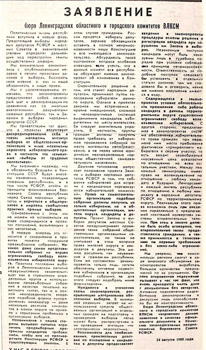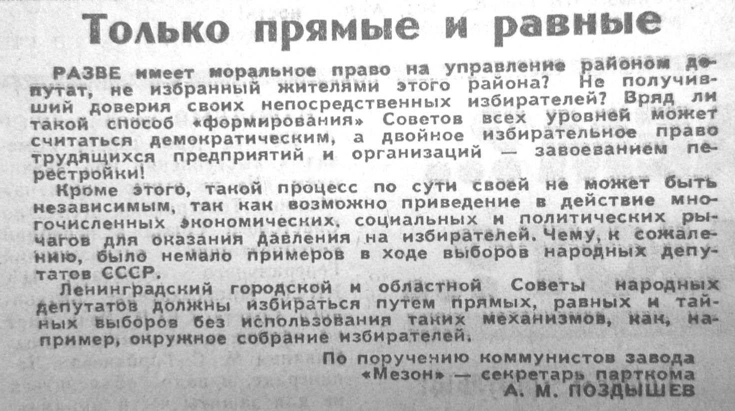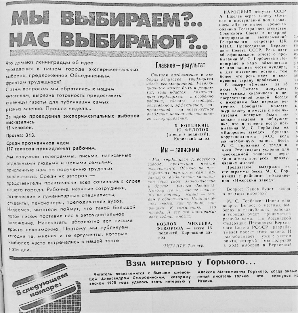 Ошеломленные небывалым к себе вниманием и объемом протестной почты, депутаты того сонного Ленсовета в конце ноября 1989 г. устроили «бурное заседание» - так написала «Смена». И отвергли предложение о проведении избирательного эксперимента.