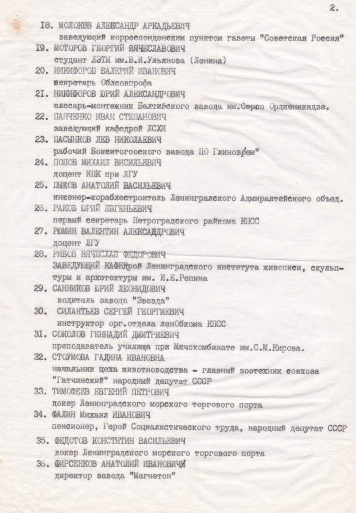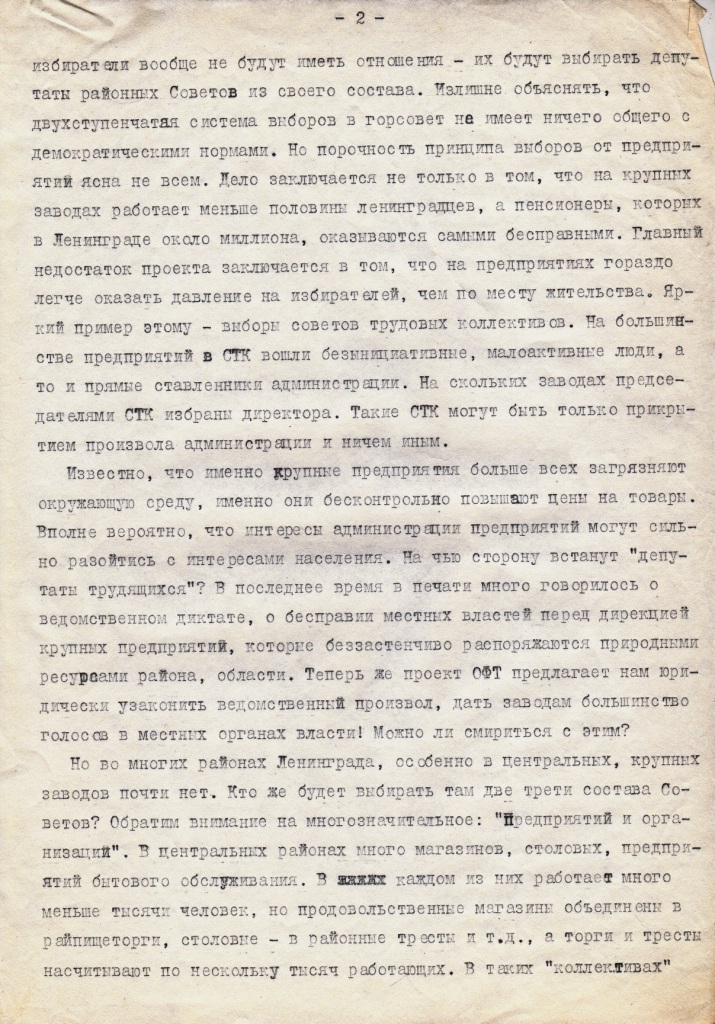Облегченно мы вздохнули после 27 октября 1989, когда были опубликованы два новых закона о выборах: российских депутатов и депутатов местных советов. Никаких производственных округов и выборов от общественных организаций в них не было. Но апологеты идеи не собирались сдаваться. Выступать против принятых законов уже никак, но зато можно предложить «избирательный эксперимент». В отдельно взятом городе, в Ленинграде, провести выборы в районные советы (на большее они уже не претендовали) по этим самым производственным округам. Ноябрь 1989 – время пропаганды «избирательного эксперимента», решение о проведении которого был вправе принять Ленсовет 20 созыва – последний в истории, подконтрольный аппарату КПСС. И развернулась борьба за влияние на этот Ленсовет. Аппарат КПСС действовал через созыв закрытых общих собраний членов КПСС на трех крупных заводах - Ленинградском металлическом, Невском машиностроительном и на Электросиле. Их роль была в том, чтобы послать в Ленсовет протоколы о поддержке «избирательного эксперимента». Но эти собрания не то чтобы прямо выступили против. Вопрос послали по большому кругу – решили отложить принятие решения, чтобы в соответствии с политикой гласности обсудить с беспартийными товарищами в цехах, участках, бригадах. В условиях того политического календаря это означало отложить навсегда, потому что по закону список и описание избирательных округов до 20 декабря 1989 г. должны быть опубликованы. Тем временем в среде ЛНФ давались рекомендации нашим сторонникам найти своего депутата Ленсовета и все ему объяснить.