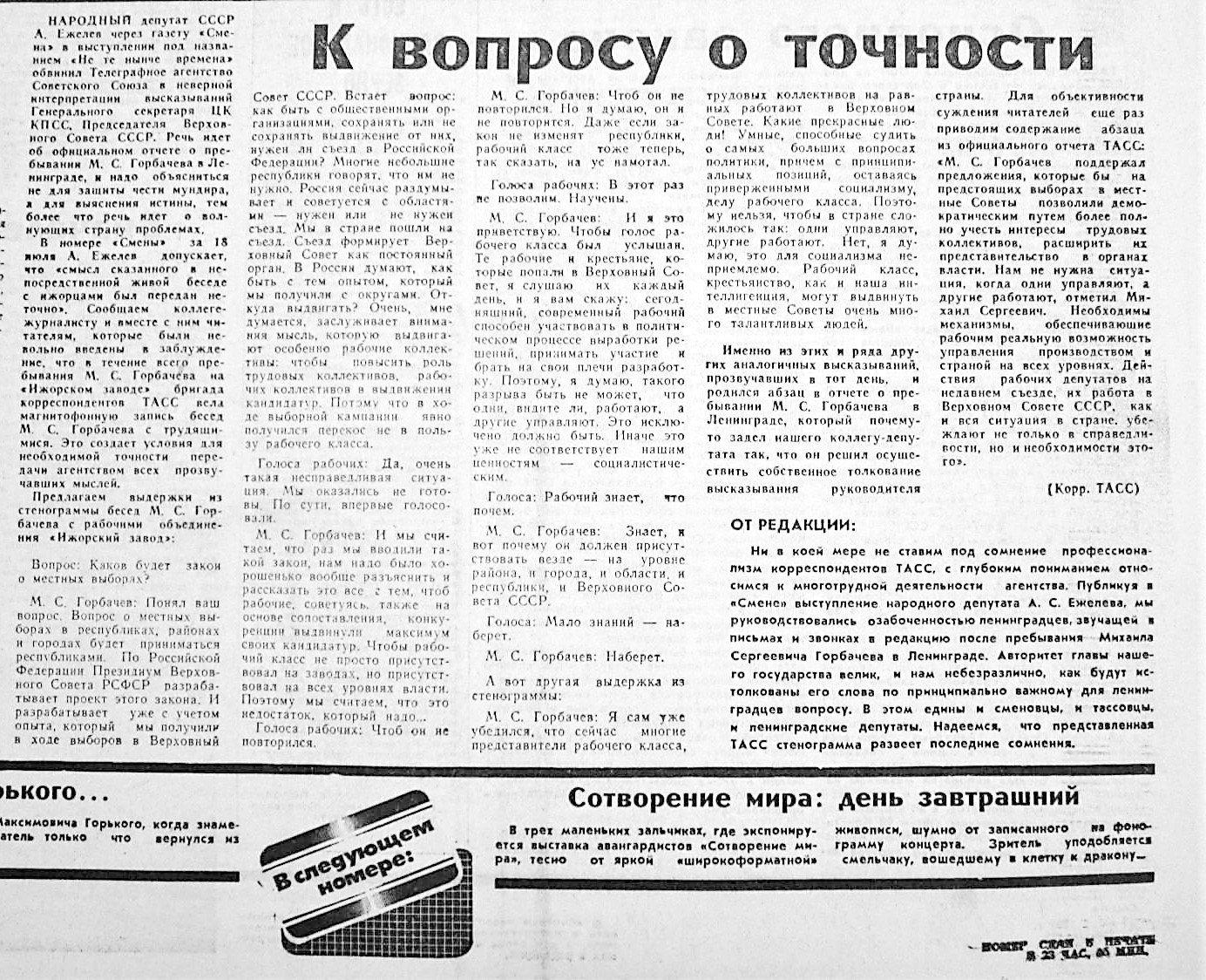 Михаил Горбачев в беседе с рабочими Ижорского завода высказался многословно и неопределенно.