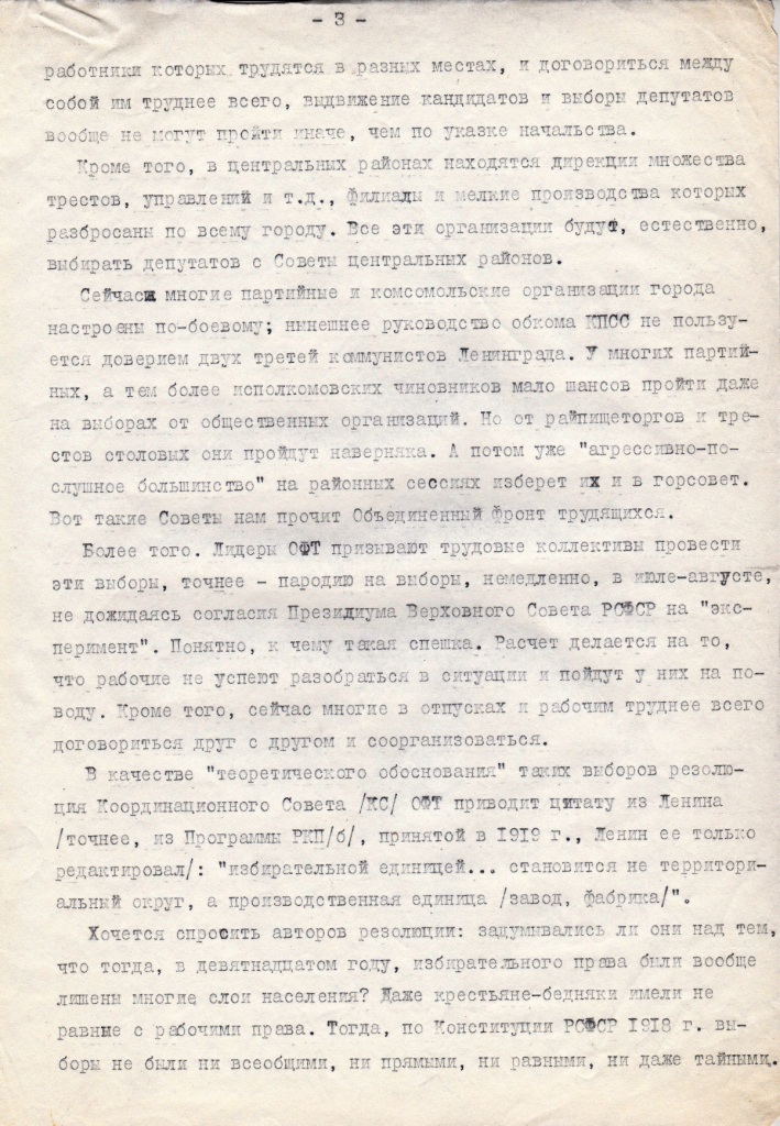 Напоминание о ленинских принципах в то время еще не вызывало отвращения, вклад Владимира Ленина в формирование в России тоталитарного строя был не всем известен. Достали из его наследия том 38, стр.425-426 и подняли на флаг идею, что основной ячейкой общества становится не территориальный округ, а производственная единица. С этого твердого основания в начале июля 1989 г. выкатилась идея выборов по производственным округам и понеслась по нашему городу.